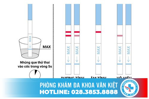 Sau khoảng 5 đến 10 phút lấy que thử thai ra kiểm tra. Nếu que thử thai hiện lên hai vạch hoặc dấu cộng thì kết quả được coi là dương tính, tức là bạn đã có thai. Nếu kết quả là 1 vạch hoặc dấu trừ thì chị em không có thai.