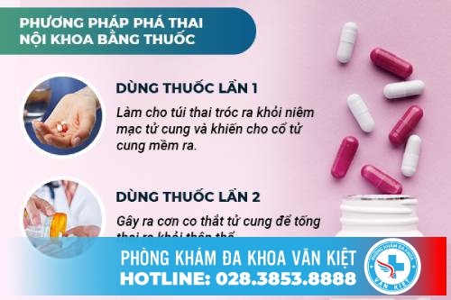 Nếu đủ điều kiện để dùng thuốc đình chỉ thai. Thai phụ sẽ được bác sĩ cho uống viên thuốc đầu tiên để thai nhi ngừng phát triển và bong ra khỏi niêm mạc tử cung. Sau 2 ngày, thai phụ tiếp tục uống viên thứ 2 để kích thích co bóp tử cung đẩy thai ra ngoài một cách tự nhiên
